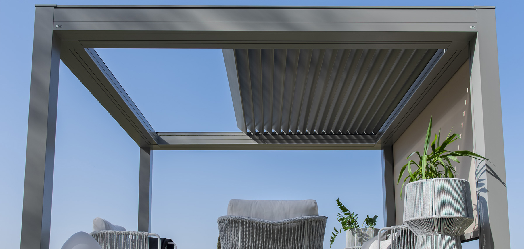 La novità principale di KEDRY SKYLIFE consiste nel tetto a lame mobili retrattili che permette di regolare l’intensità della luce e la ventilazione, in funzione delle condizioni meteo. Il sistema è innovativo: con un unico movimento le lame ruotano e arretrano, in apertura e chiusura, consentendo di esprimere al massimo il concetto di regolazione termica e luminosa.