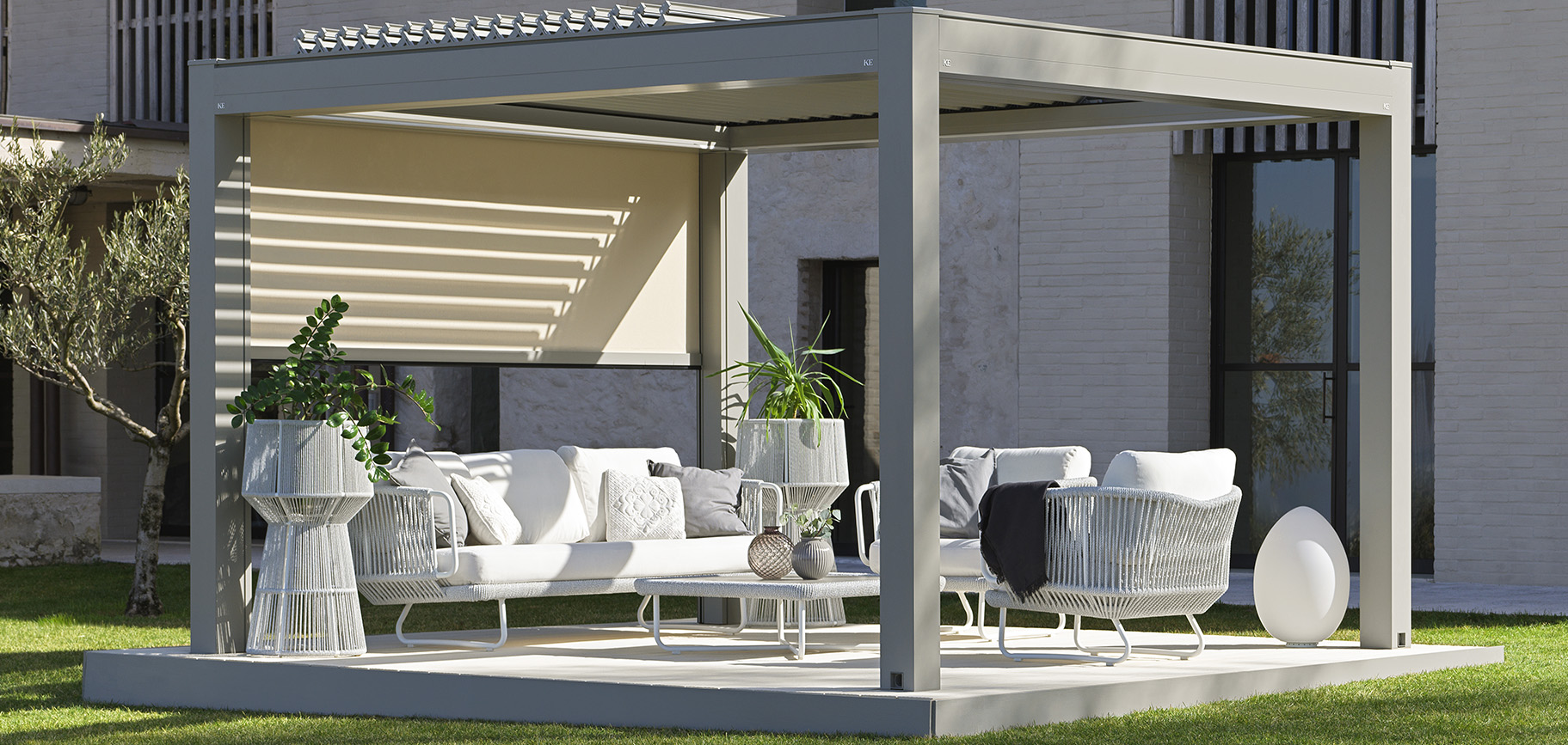 Grazie alla sua completa modularità, la pergola bioclimatica KEDRY SKYLIFE con lamelle retrattili si presta ad essere inserita ed adattata in spazi di forme diverse, coprendo ampie metrature, e con un impatto estetico minimale.
